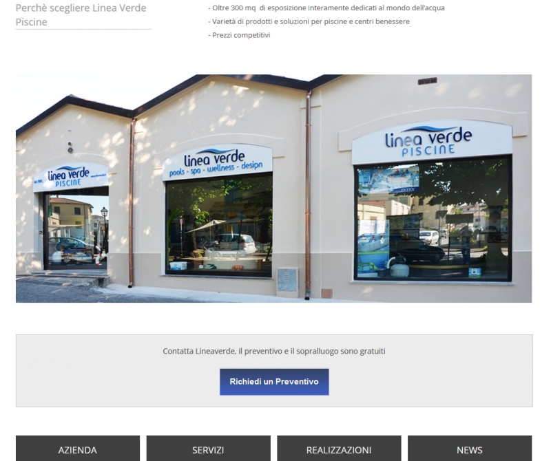 Linea verde piscine fin dal 1989 opera con passione in tutto il centro italia nella costruzione di piscine e centri benessere garantendo una continua assistenza al cliente e la sicurezza di prodotti certificati UNI con alte garanzie nel tempo. L'azienda è l'unica in grado di effettuare tutte le fasi dalla progettazione alla vendita costruzione realizzazione e assistenza di piscine ad uso privato e pubblico in umbria e toscana.